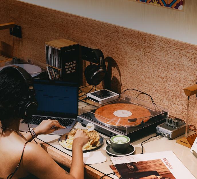 Book a private listening station. Turntable, pre-amp, headphones ready.